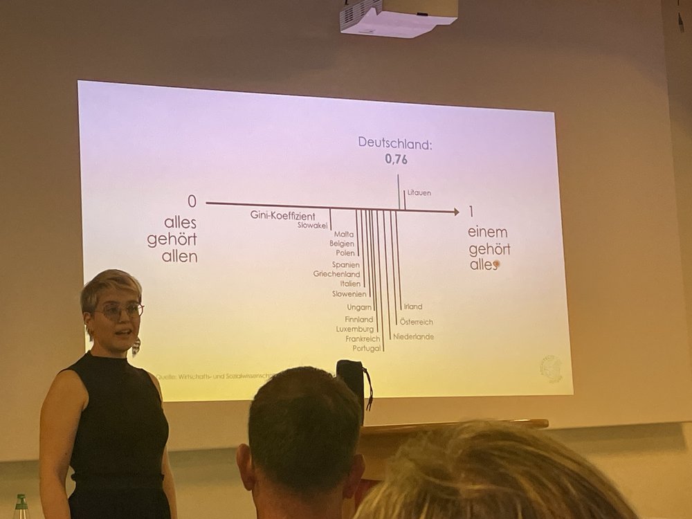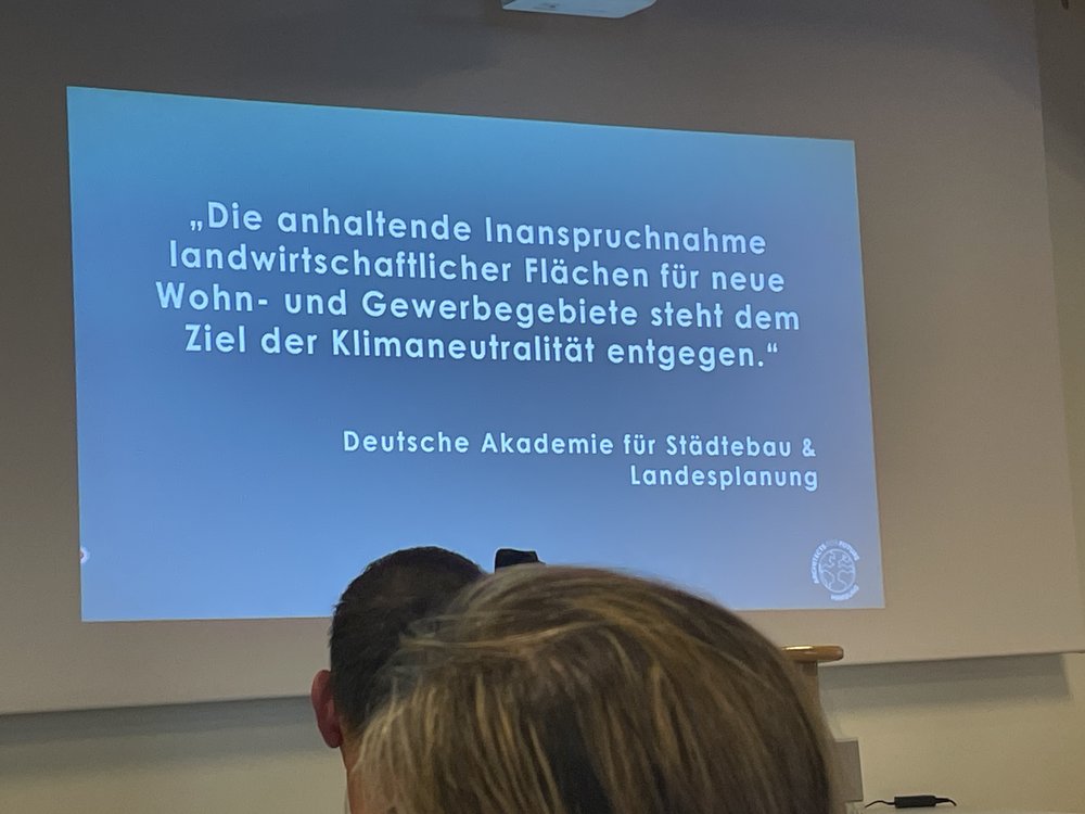 Judith Nurmann zeigte auf, wie wichtig eine Reduktion des Flächenverbrauchs in Zukunft ist und wie gleichzeitig Kommunen alle Möglichkeiten nutzen sollten, um eigene Flächen möglichst sozialverträglich zu nutzen. Als positives Beispiel wurde dabei die Stadt Ulm erwähnt, die mit ca. 40% der Flächen in öffentlicher Hand und weiteren Maßnahmen eine vergleichsweise entspannte und nachhaltige Situation am Wohnungsmarkt geschaffen hat.