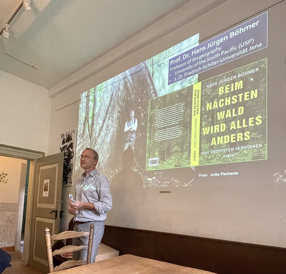 Am Tag des offenen Denkmals haben sich 35 Interessierte in der Alten Oberförsterei eingefunden, um einem hochkarätigen Vortrag des international renommierten Waldexperten Hans Jürgen Böhmer zu lauschen. Er ist zur Zeit Gastwissenschaftler an der Friedrich-Schiller-Universtität Jena, nachdem er von 2014-2020 Inhaber des Lehrstuhls für Biogeografie an der University of the South Pacific war.
