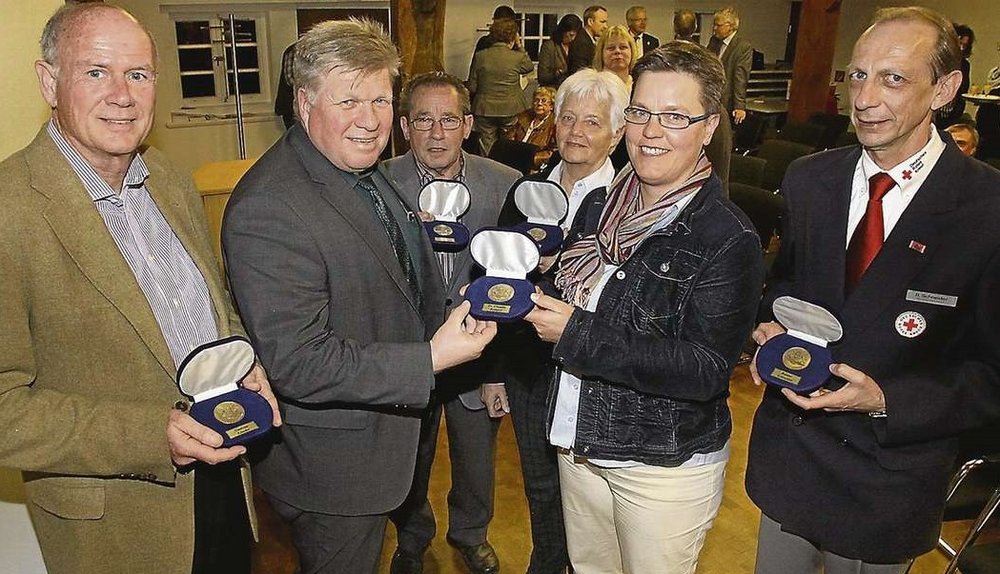 Dr. Waltraut Niehaus, Dr. Claudia Kemper, Gudrun Lösche (vertreten durch ihren Ehemann Claus-Dieter Lösche), Rainer Schneider und Erich Höptner nahmen ihre Medaillen vor rund 40 Gästen im Vorwerk der Bassumer Freudenburg entgegen und bestehen Stellvertretend für die vielen ehrenamtlichen Bassumer.