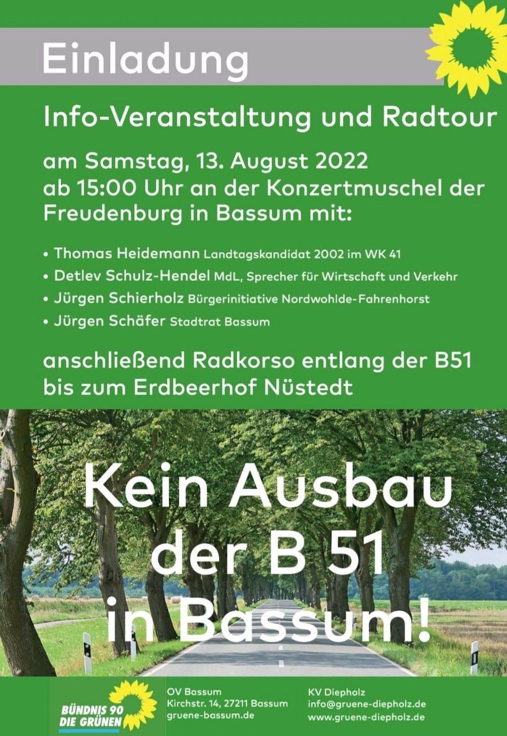 Ab 15.00 Uhr im Park der Freudenburg in Bassum "Kein Ausbau der B51", Diskussion, Statements, Ausblick mit anschließendem Farhrradkorso entlang der B51 zum Hof Nüstedt.