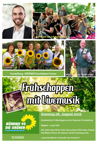 Am 28.8. veranstaltet der Kreisverband des Landkreises Diepholz und der Ortsverband Bassum von B90/DieGrünen, einen gemeinsamen Musikfrühschoppen