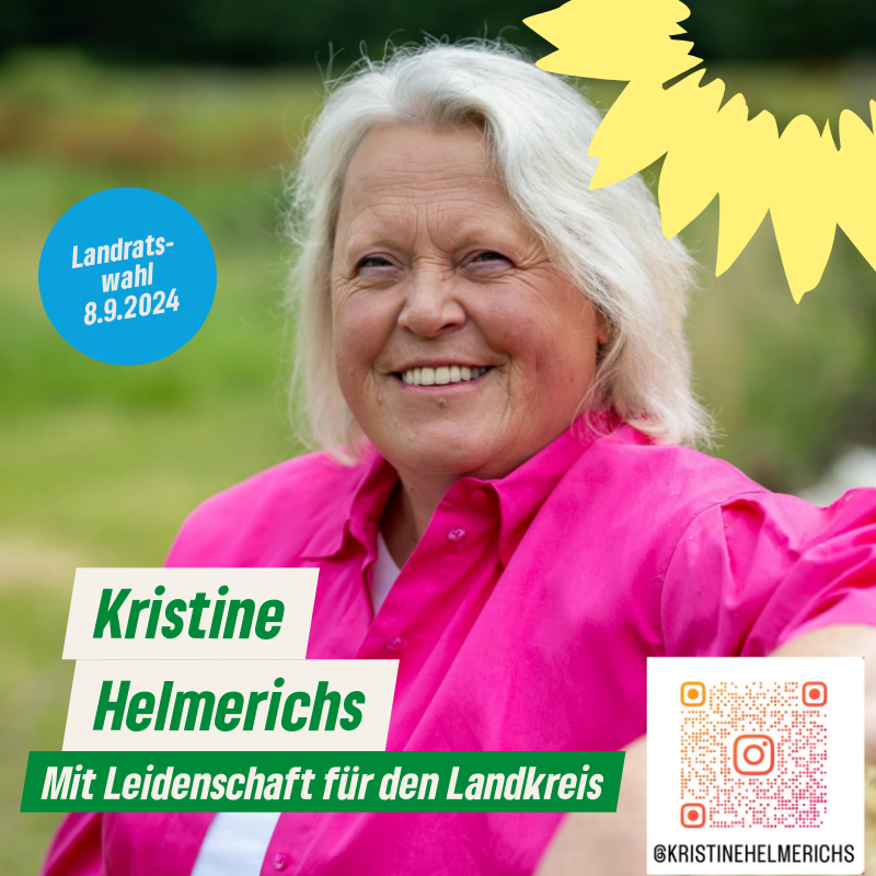Alle Informationen, Termine und Neuigkeiten zu unserer Kandidatin Kristine Helmerichs und zur Wahl der Landrätin / des Landrats findet ihr gebündelt auf der Webseite des Grünen Kreisverbands Diepholz und auf Instagram. Schaut gerne und regelmäßig vorbei!