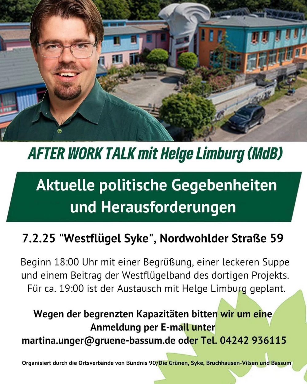 Am 07. Februar gibt es ab 18:00 Uhr einen After Work Talk mit MdB Helge Limburg im Westflügel Syke. Die Veranstaltung ist öffentlich und kostenlos.