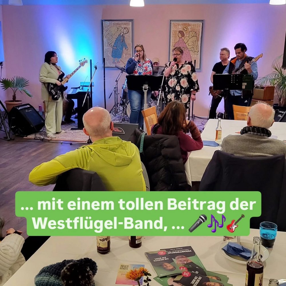 Die Lebens- und Arbeitsgemeinschaft Westflügel bietet sich an als zeitweiliger Lebensort für Menschen, die in ihrer psychischen Erkrankung Lebenssinn, Orientierung und Perspektive verloren haben. Zu Beginn der Veranstaltung stellten einige der Westflügel-Bewohner*innen diese Einrichtung den Gästen vor. Anschließend gab es einen gelungenen Beitrag der Westflügel-Band, die die Gäste mit mehreren Stücken begeisterte. Sogar kulinarisch wurden die Gäste mit einer leckeren Suppe verwöhnt.